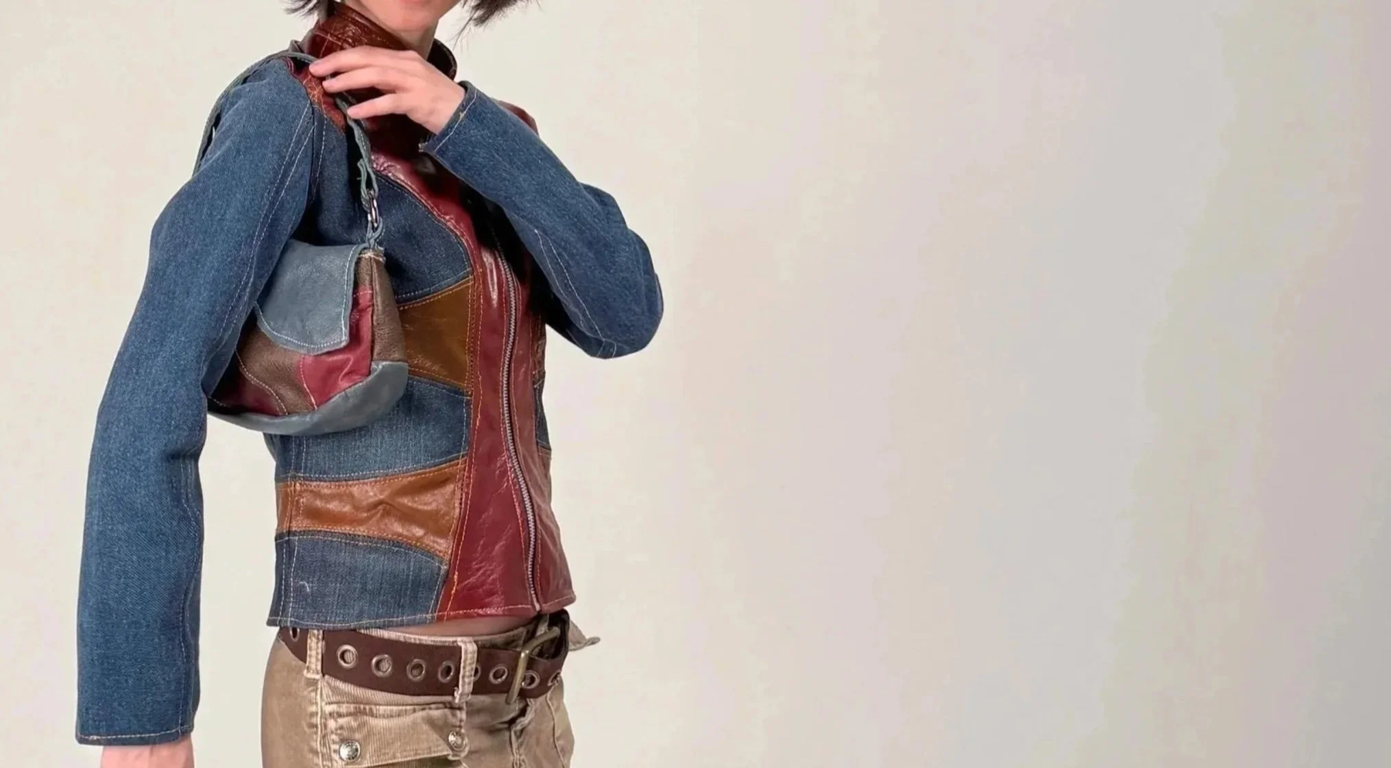 Young woman with short dark hair modeling her handmade, brown leather and blue denim patchwork leather jacket. The materials are recycled. She is wearing a khaki skirt and standing in front of a white brick wall.